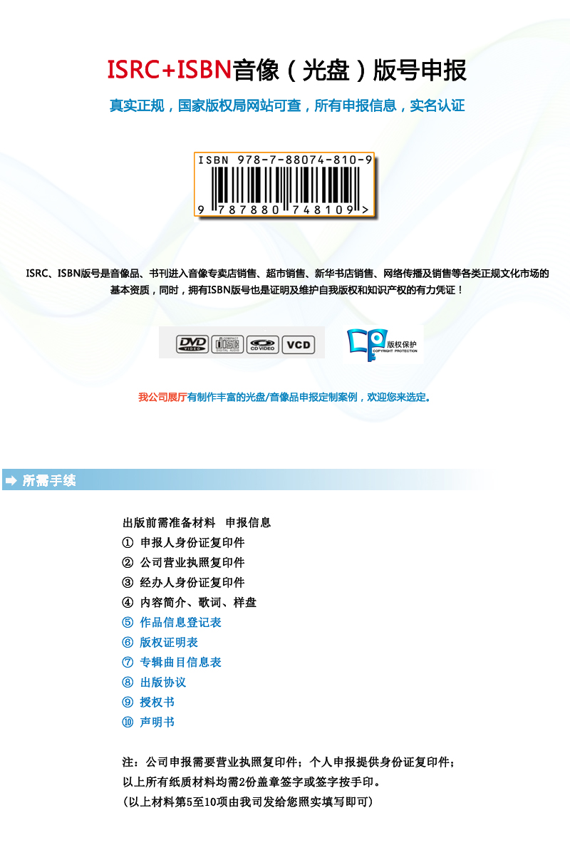 从ISBN-ISRC版权申报出版、印刷成品定制等,为您需求提供全流程满意服务。